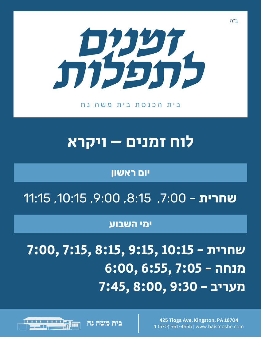 With Chasidus Shiur at 9:00 AM (10:30 AM on Shabbos Mevarchim with Chasidus at 10:00 AM)